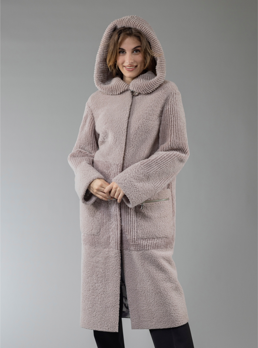 Длинное пальто с капюшоном из овчины с эффектом керли, классическая модель в современном звучании. Строгий прямой силуэт пальто, плоский завиток керли, крой цельными пластинами — все это элементы классики зимнего гардероба. Пикантные нотки придает изделию выраженный ребристый рисунок, полученный путем особой обработки овчины. Фактурные ребристые вставки отчетливо выделяются на передней и задней части изделия, отделке капюшона и рукавов. Еще один необычный акцент — застежки-молнии на накладных карманах. Пудровый цвет «розгольд» делает образ свежим и женственным. Вы можете не заботиться ни о головном уборе, ни о дополнительных украшениях — шуба «Алиса» объединила в себе все, что нужно в промозглое межсезонье или европейской зимой.Характеристики